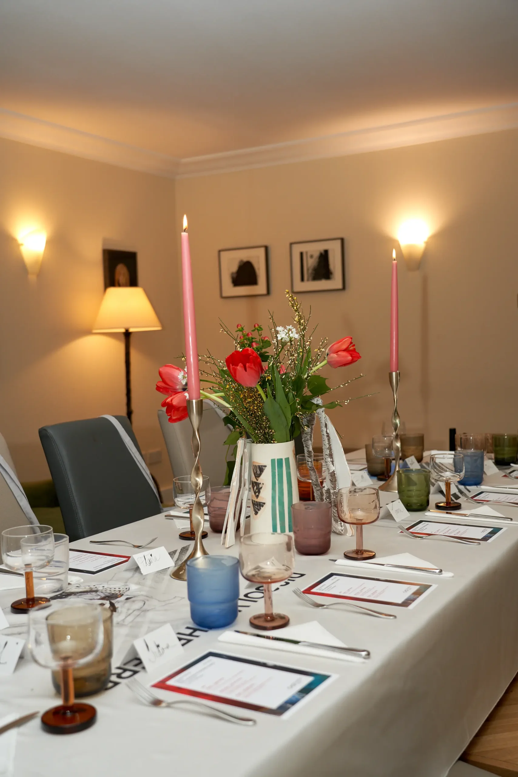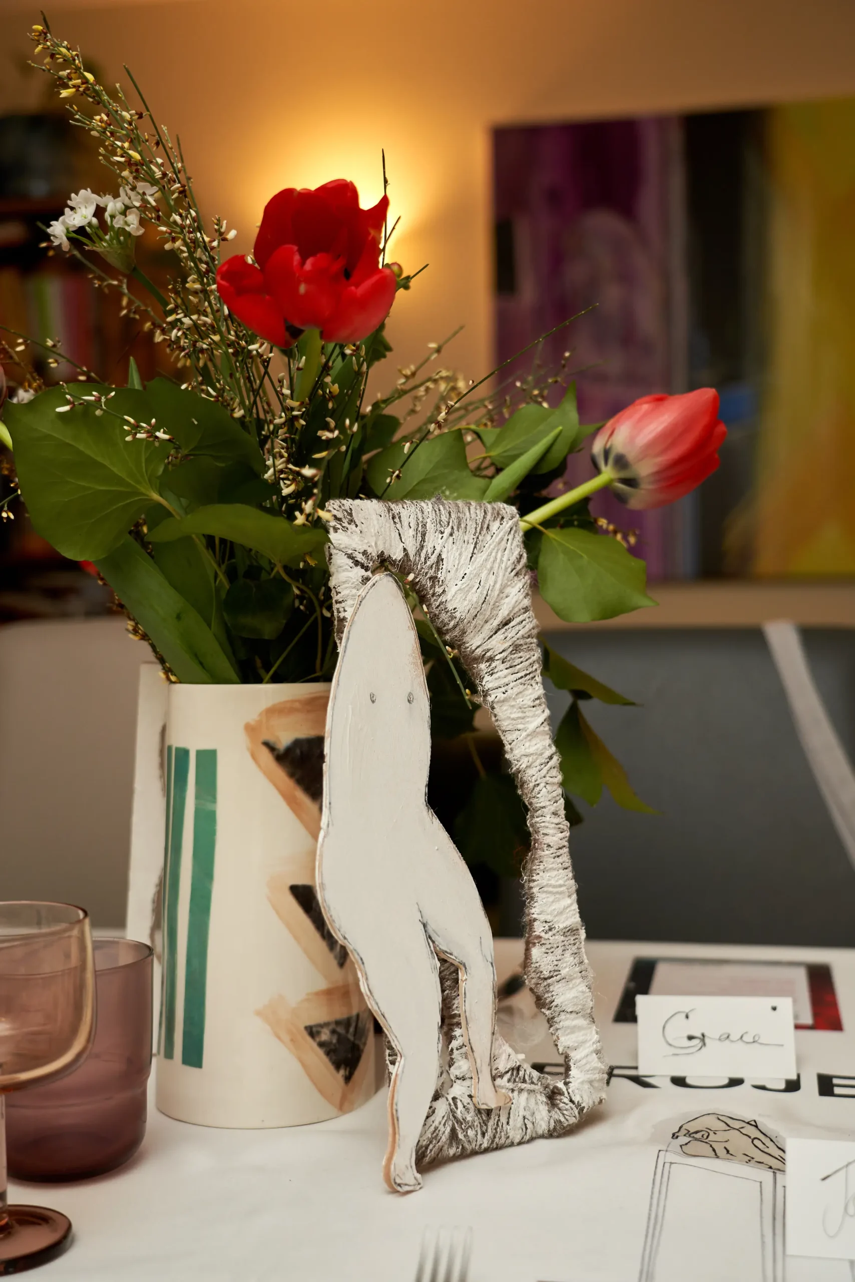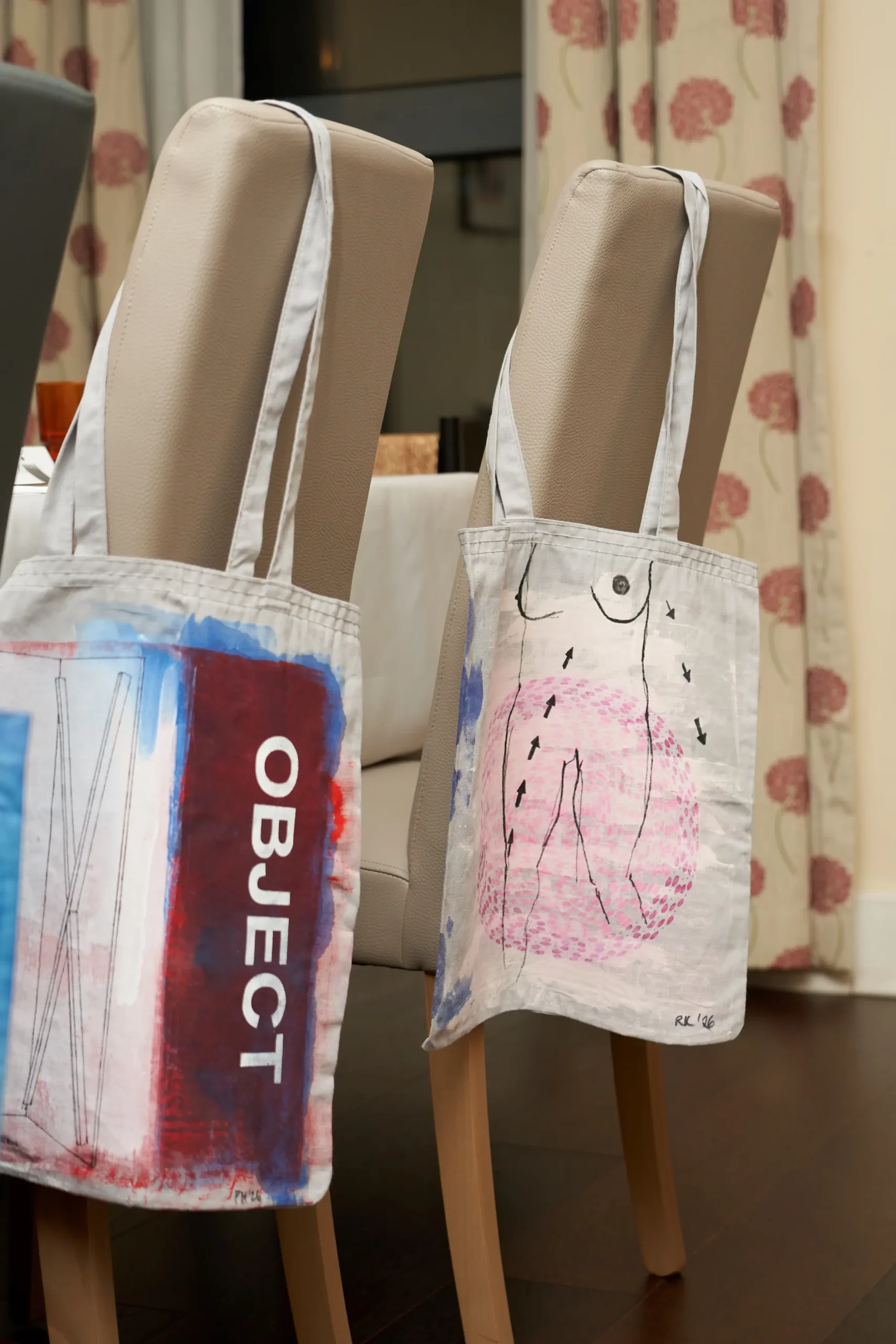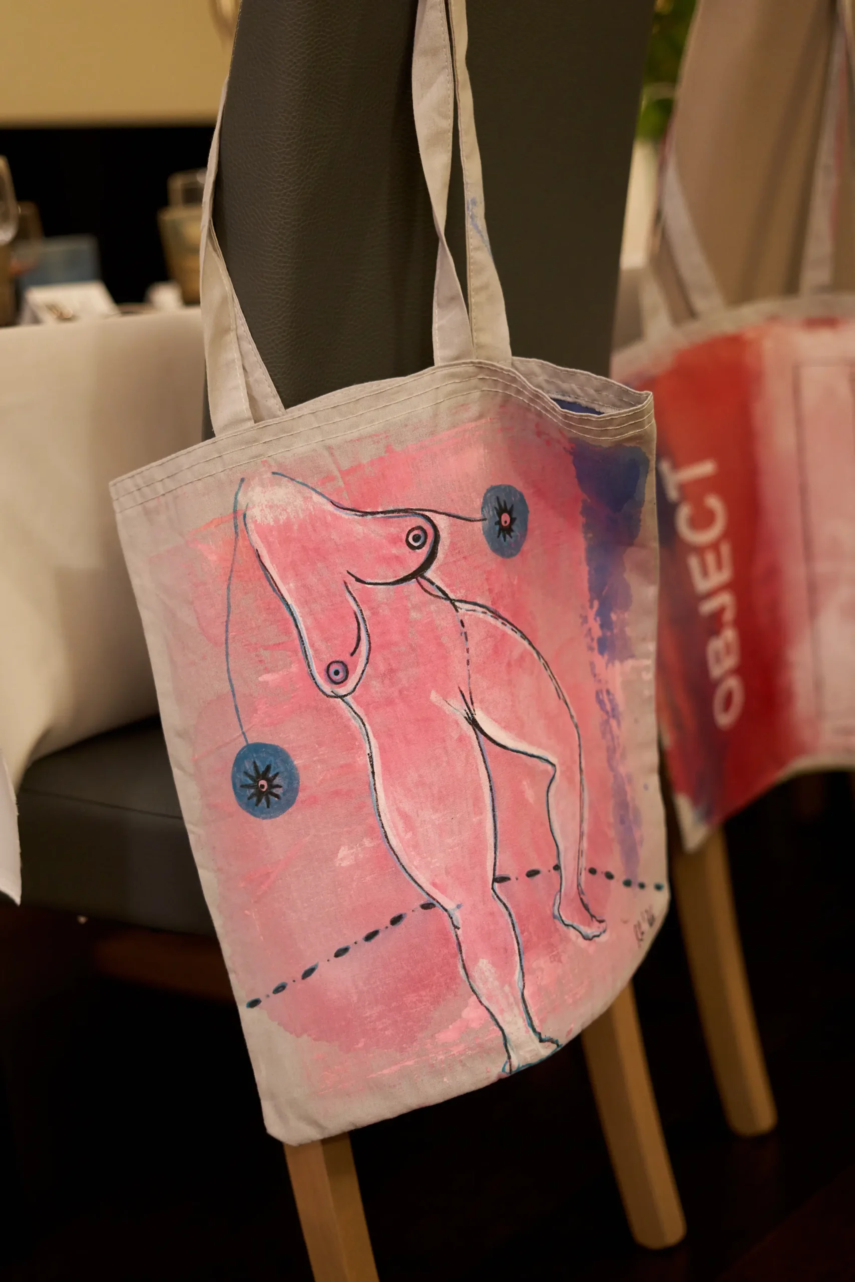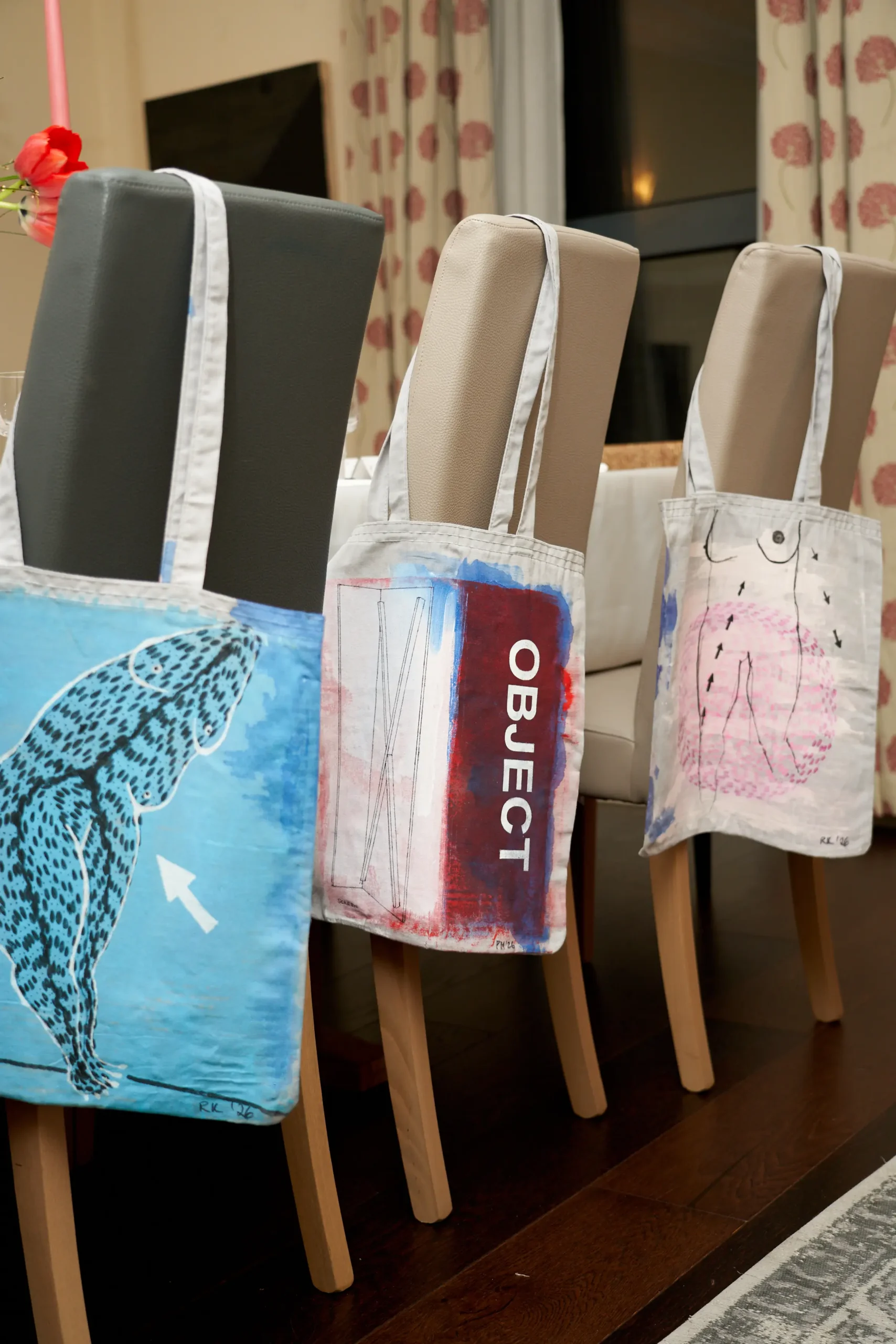 Guests were also invited to take part beyond the meal. Bespoke painted tote bags, created for the occasion, extended the artists’ practices into a functional, portable object, while a collective action at the table gently activated participation, exchange, and shared attention. The evening moved fluidly between installation, conversation, and conviviality, holding the table as both artwork and gathering.