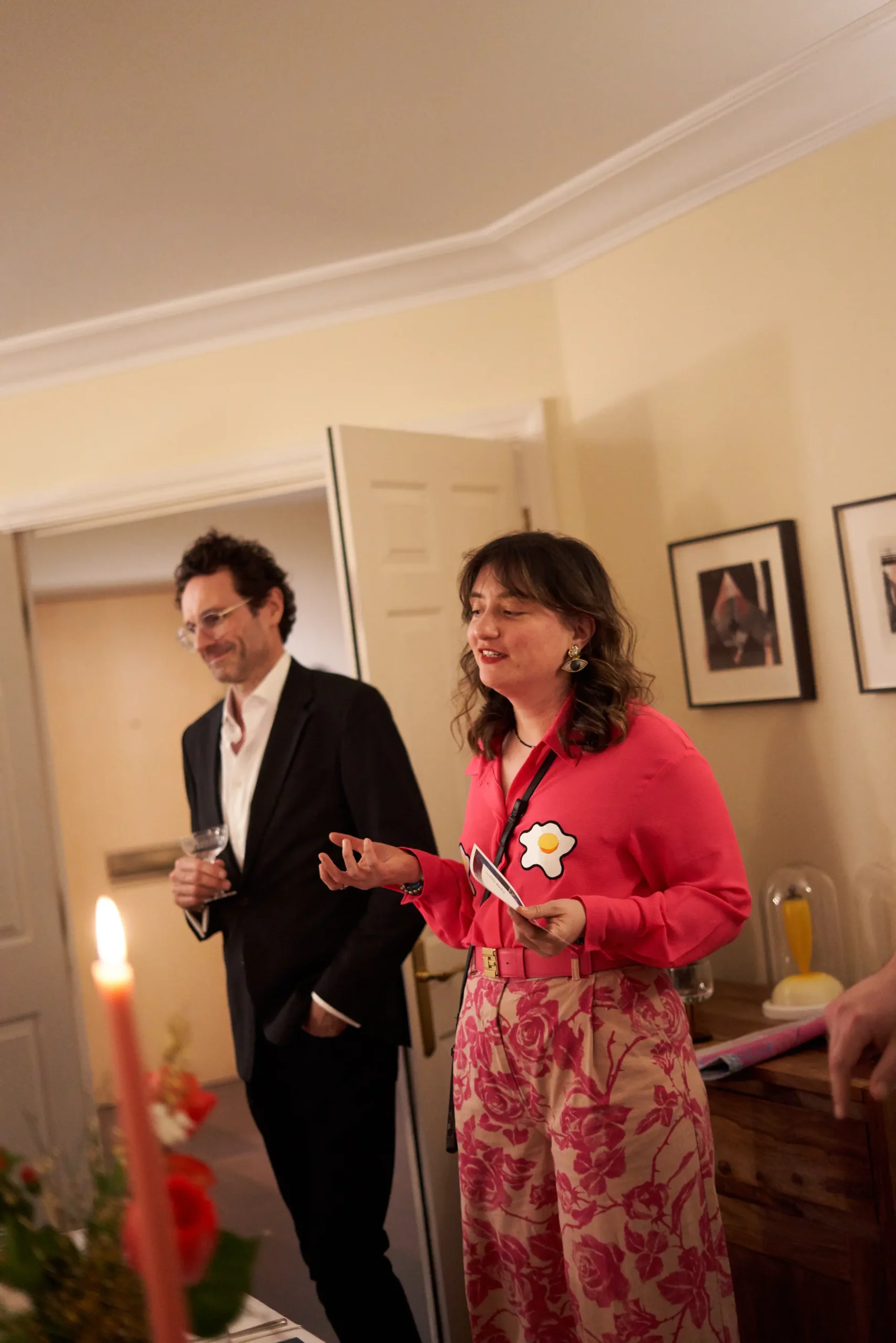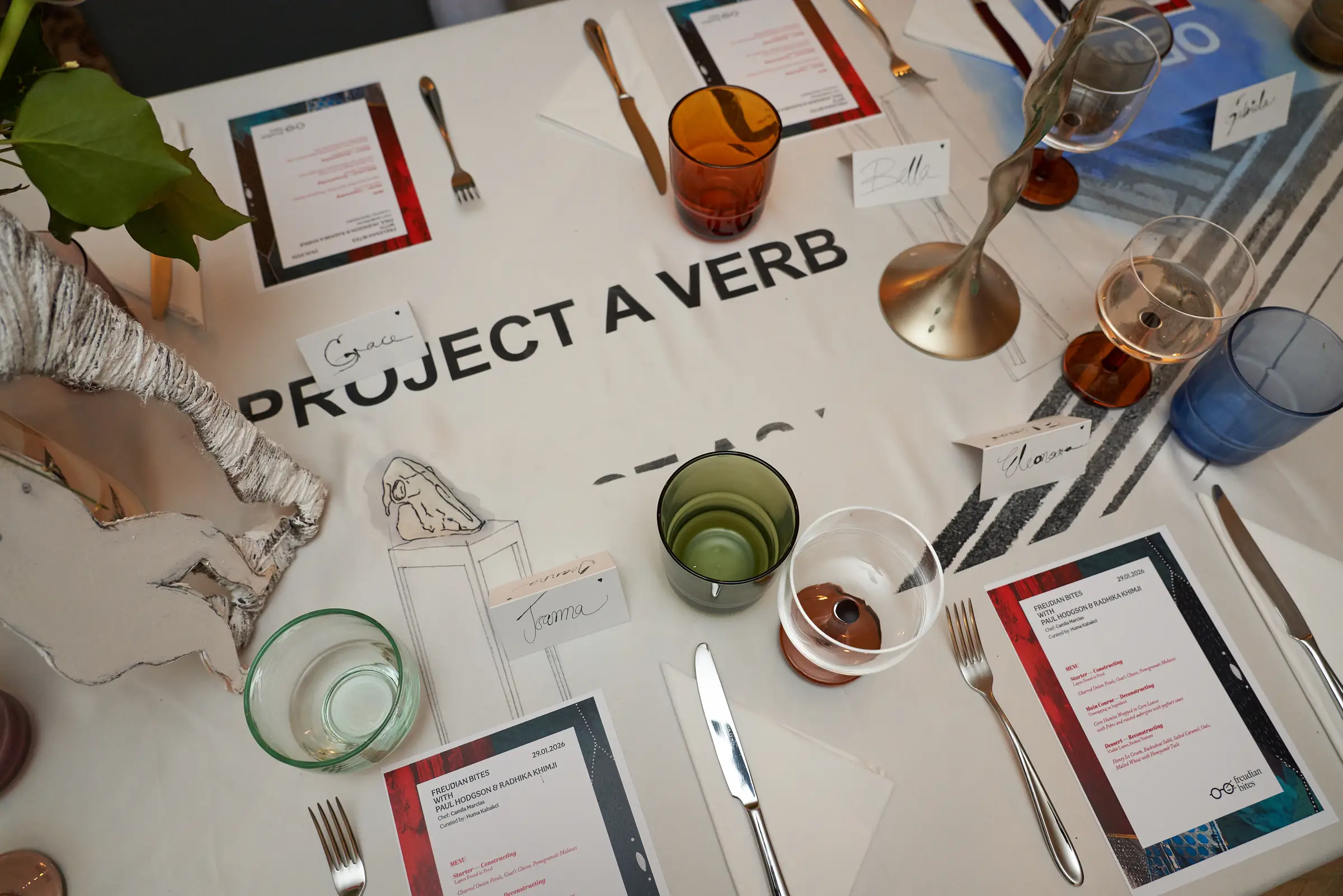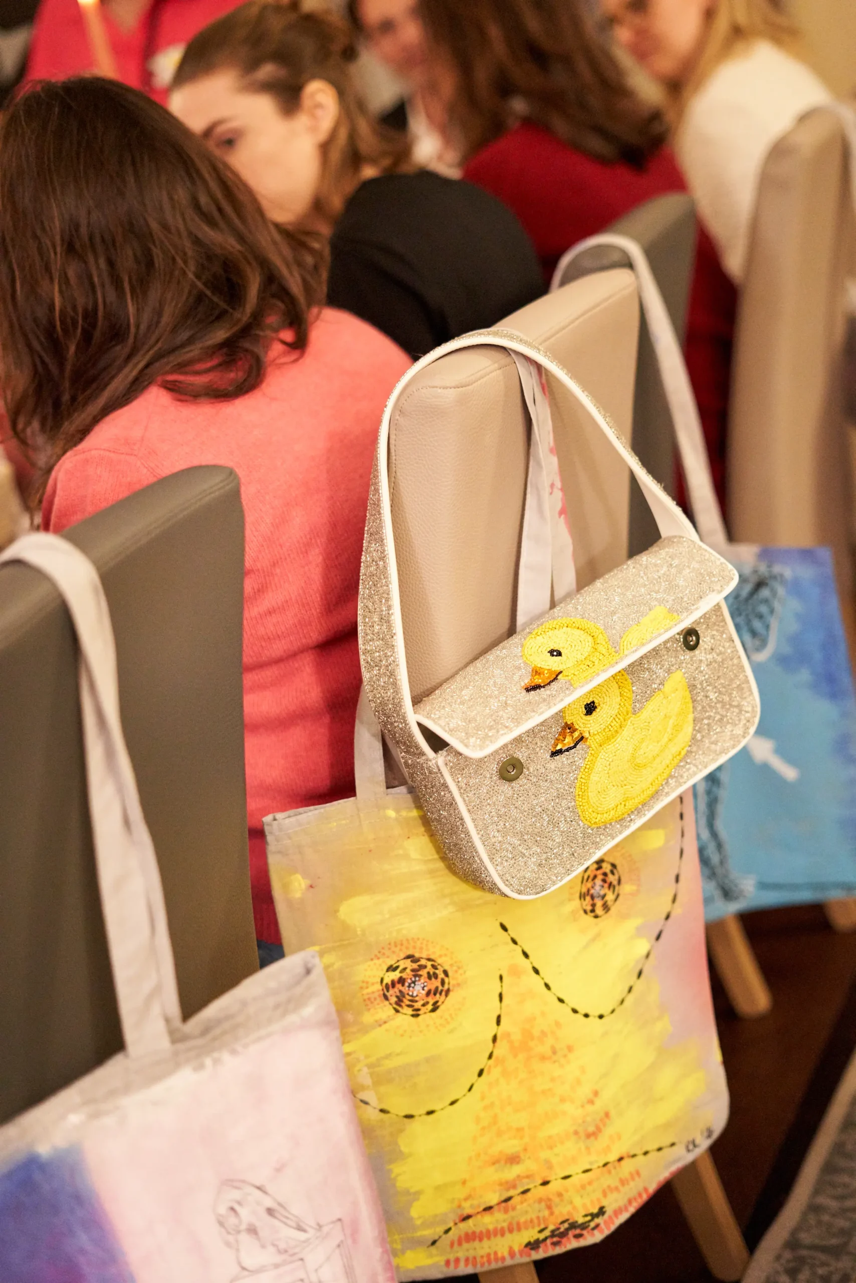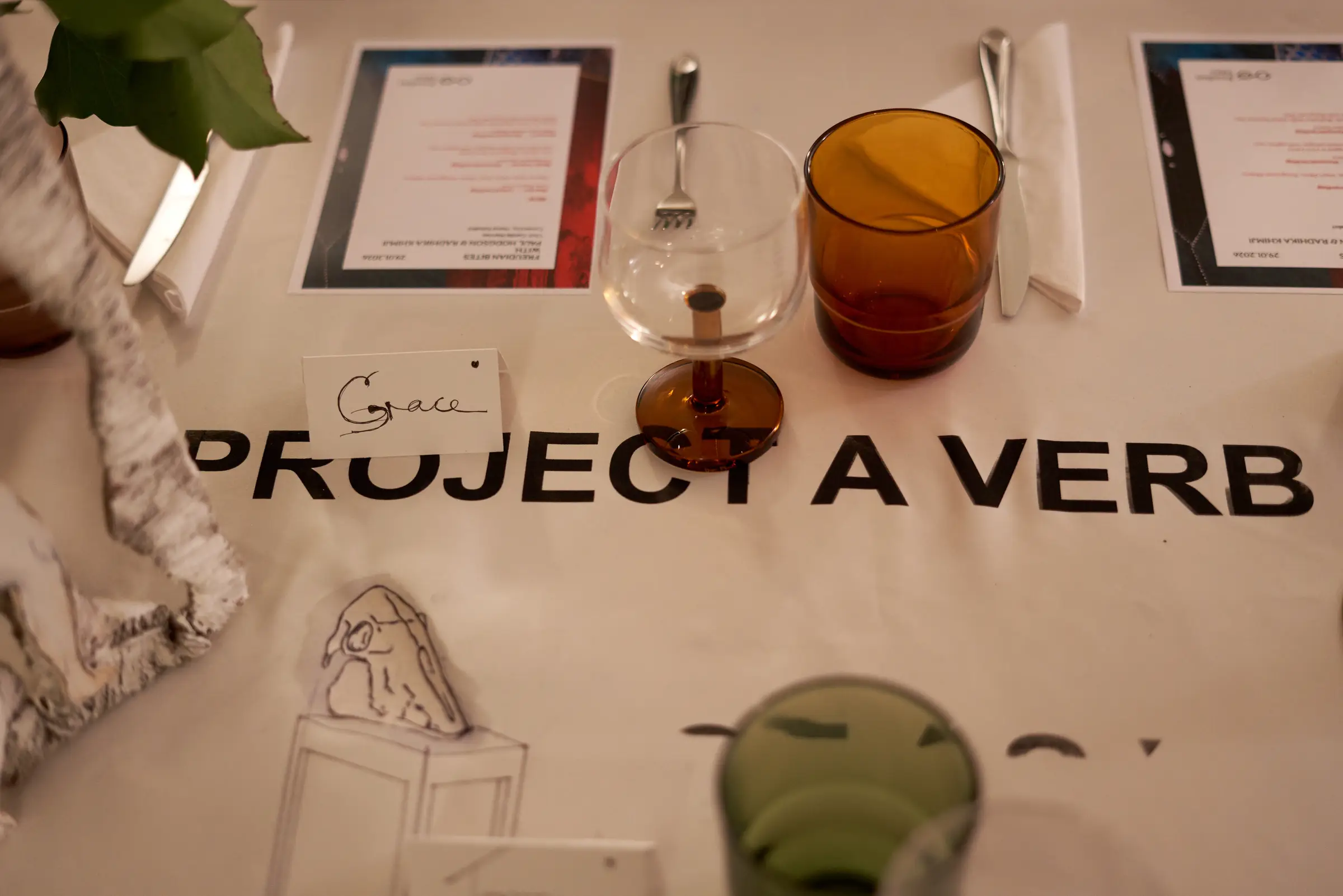 Guests were also invited to take part beyond the meal. Bespoke painted tote bags, created for the occasion, extended the artists’ practices into a functional, portable object, while a collective action at the table gently activated participation, exchange, and shared attention. The evening moved fluidly between installation, conversation, and conviviality, holding the table as both artwork and gathering.