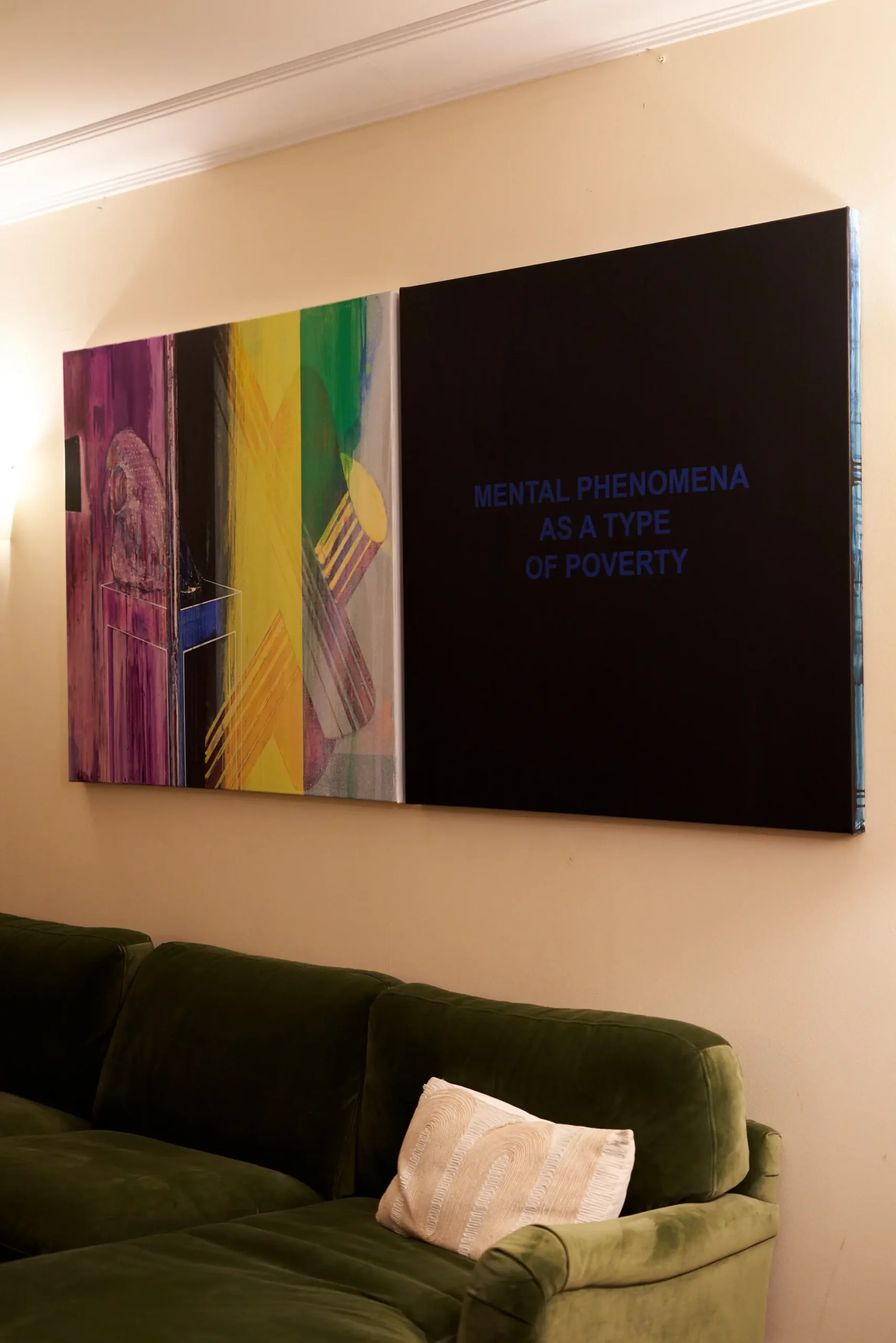 The living room was activated as a site of live practice. Khimji introduced a cut-out sculptural work that entered the table as a physical presence, interrupting the logic of place-setting and inviting the body, line, and negative space into close proximity. Hodgson re-scripted the surface of the table itself through a bespoke screen-printed tablecloth, transforming it into an artwork in motion and foregrounding the often-invisible gestures, residues, and decisions that underpin artistic production.
